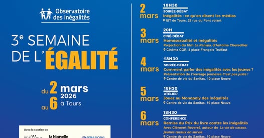 L’Observatoire des inégalités  est une référence au niveau national et son siège est à Tours. Il vous y donne rendez-vous pour la troisième édition de la « Semaine de l’égalité », du 2 au 6 mars 2026.